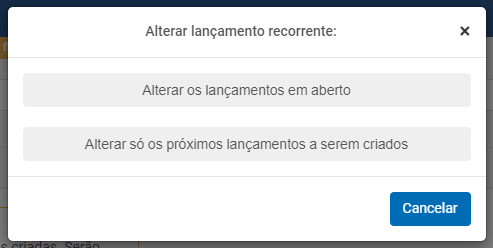 Alteração: ao alterar uma recorrência você pode escolher alterar também os lançamentos já criados em aberto ou somente os próximos lançamentos a serem criados.